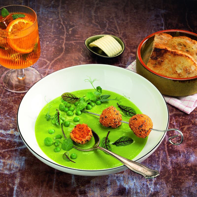 Rund, bunt, pikant: Vegane Kichererbsen-Falafel mit gegrillter Paprika und traditionellem Harissa-Gewürz. Umhüllt von einer knusprigen Karottenpanade krönen sie Sharing-Plates, Mezze & mehr. Vorgebacken zum erneuten Durcherhitzen, tiefgefroren.