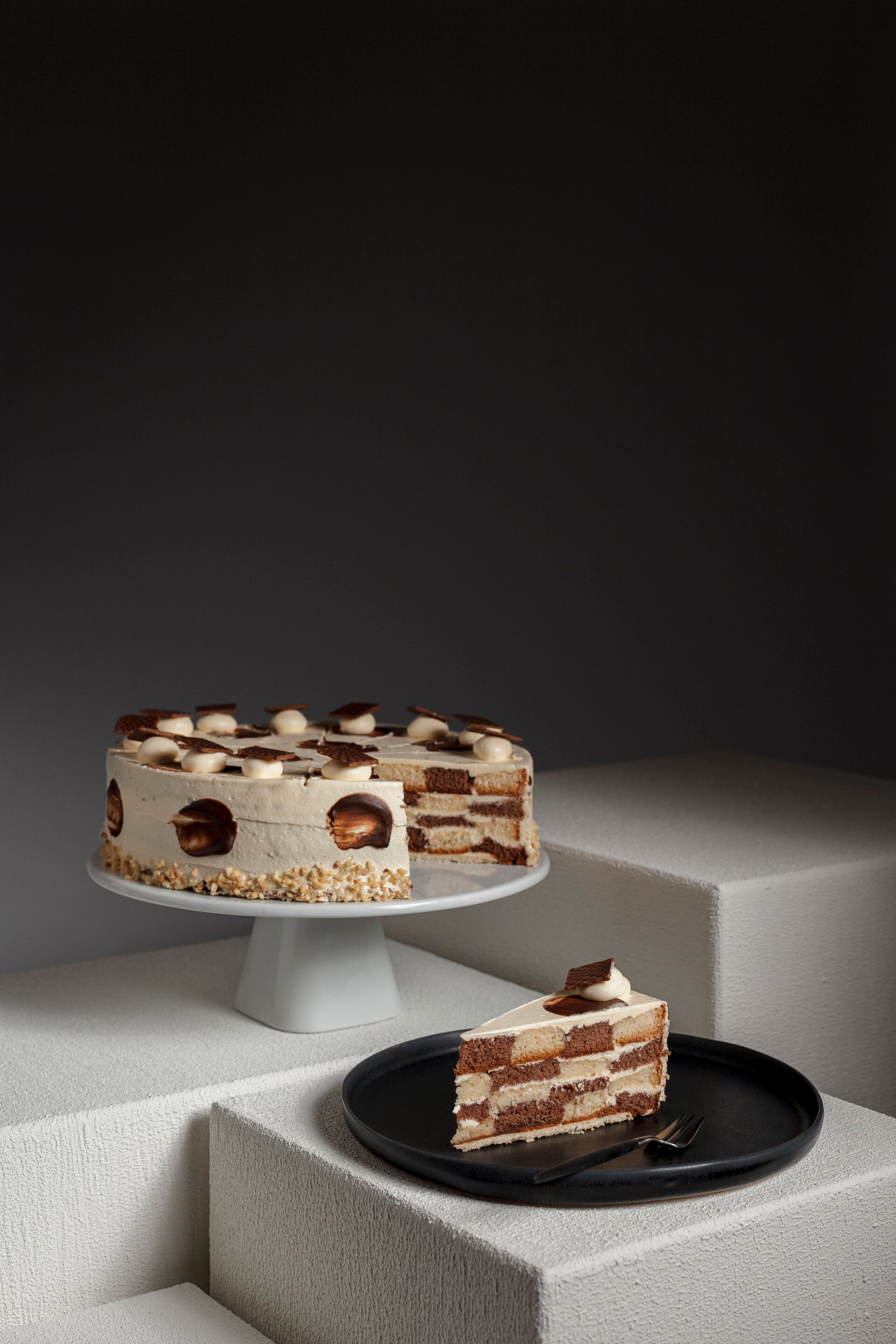 Aus dunklem und hellem Biskuit wird diese locker-cremige Torte kunstvoll gefertigt. Im Anschnitt zeigt sich ein interessantes Schachbrettmuster. Dekor: Rosetten und Schokoblättchen. Fertig gebacken, tiefgefroren.