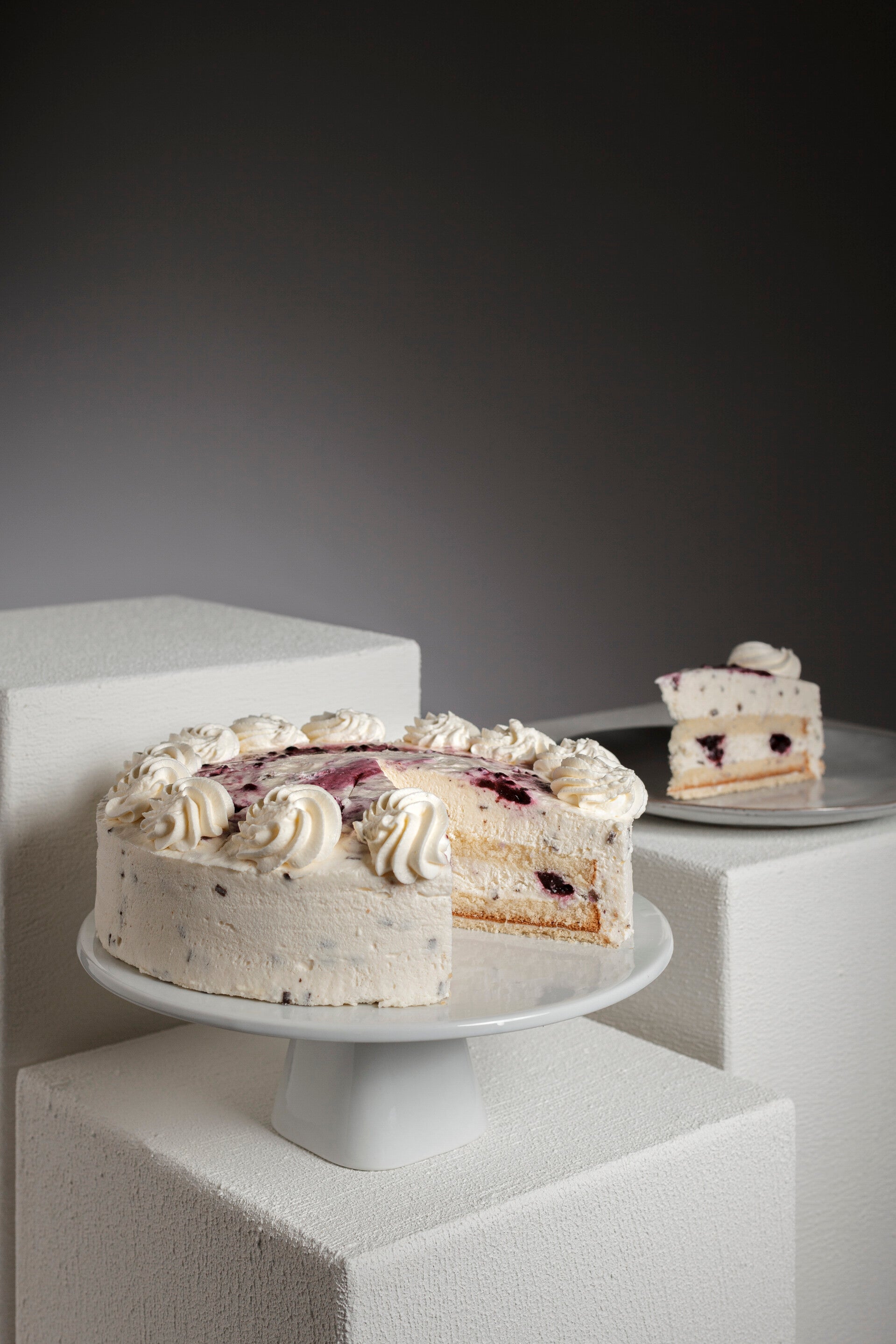 Ein Mürbteig- und zwei helle Biskuitböden, gefüllt mit feinstem Stracciatella-Rahm und Heidelbeeren. Dekor: Mit Heidelbeeren marmorierter Stracciatella-Rahm. Torte ohne Einteilung, individuell portionierbar. Fertig gebacken, tiefgefroren.