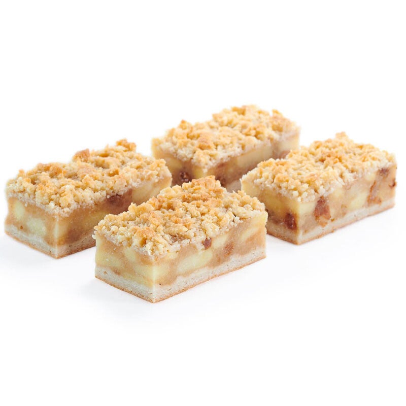 Auf einem Quarkteig liegen frische Äpfel und Sultaninen, die mit krossen goldgelben Butterstreuseln bedeckt sind. Fertig gebacken und tiefgefroren.