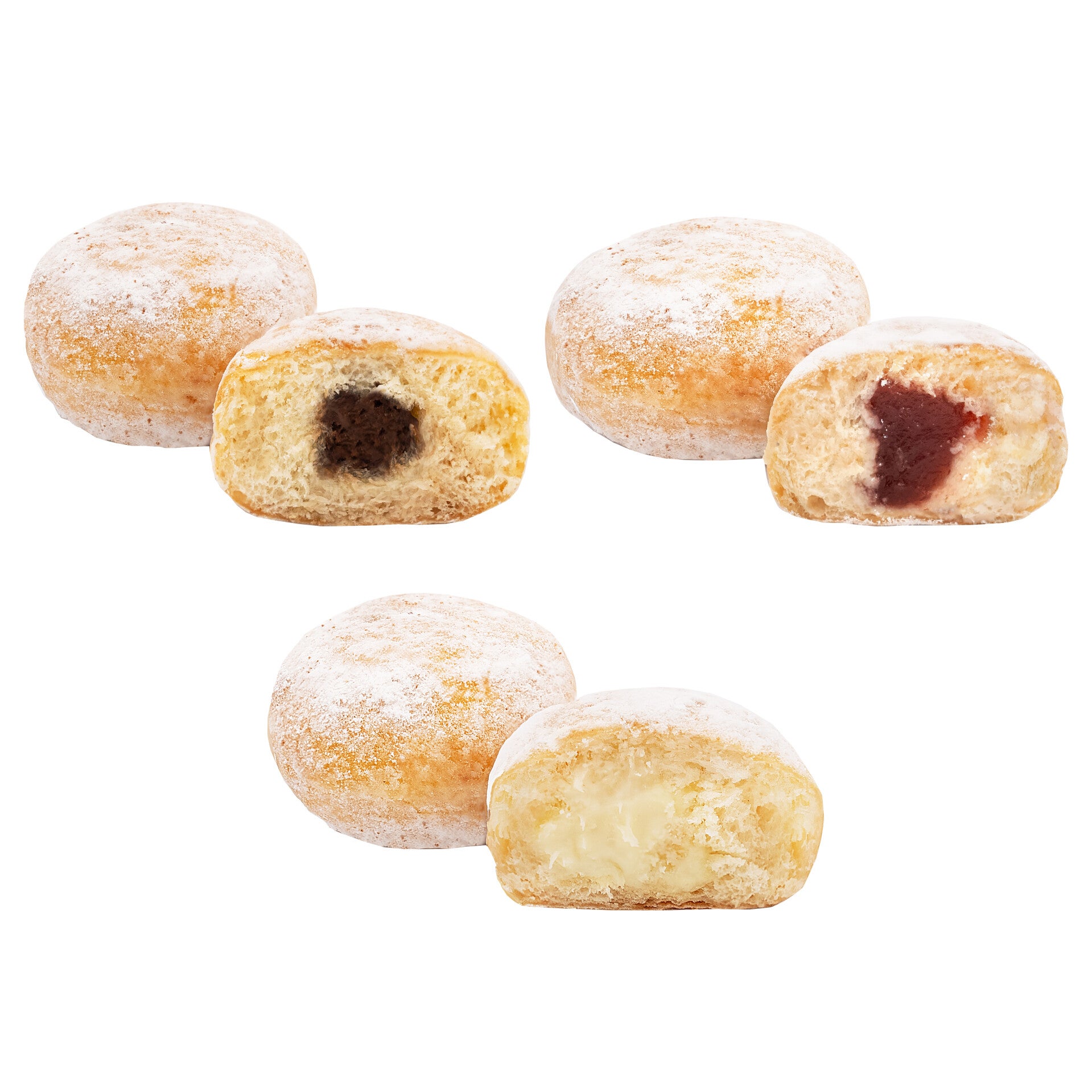 Micro-Berliner Mischkiste in den Sorten: Beerenfüllung, weisser Schokolade und Haselnussfüllung. Fertig gebacken und tiefgefroren.