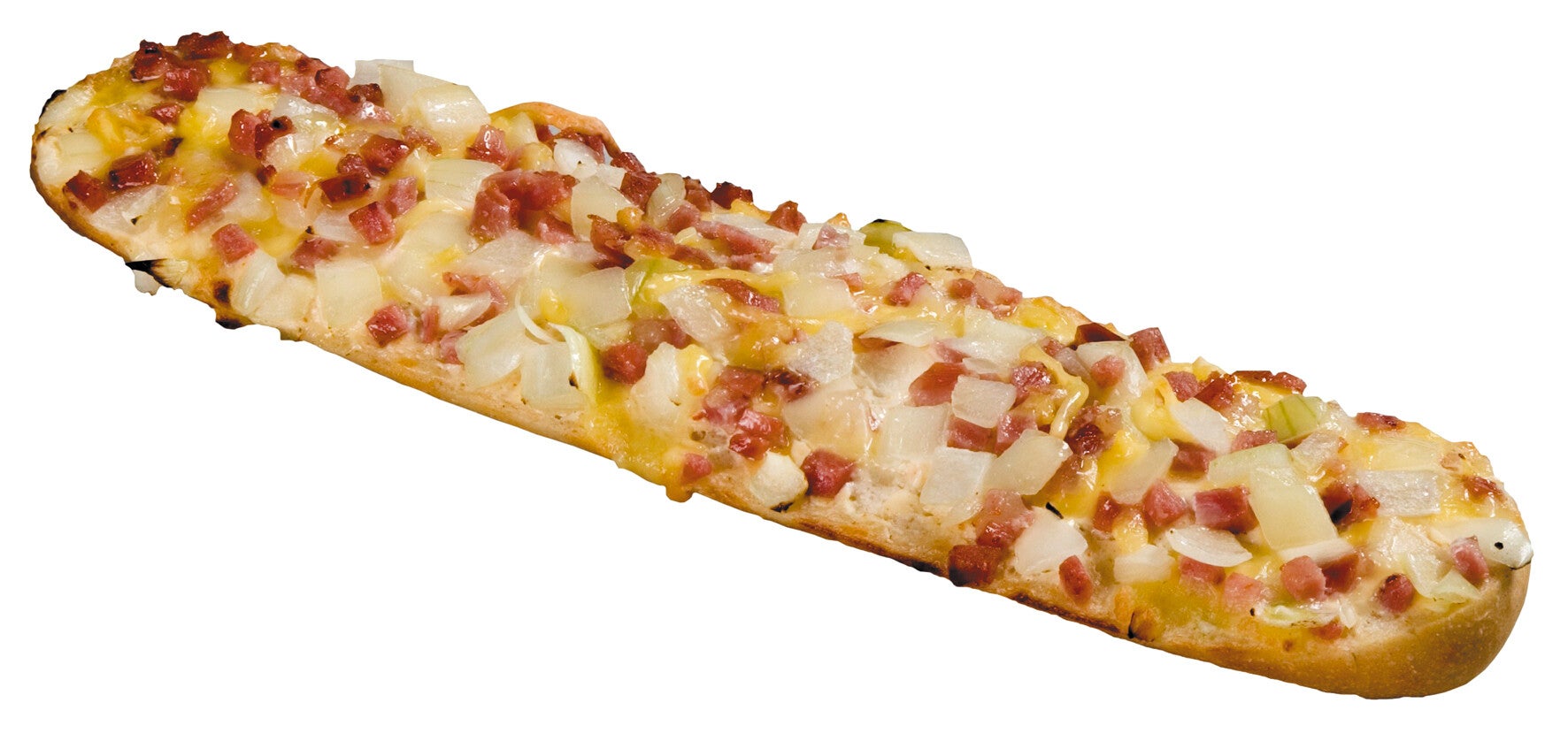 Ein überbackenes Baguette mit dem beliebten Geschmack herzhafter Flammkuchen ist der ideale Snack. Ein deftiger Belag aus Speck, Zwiebeln und würzigem Käse. Vorgebacken und tiefgefroren.