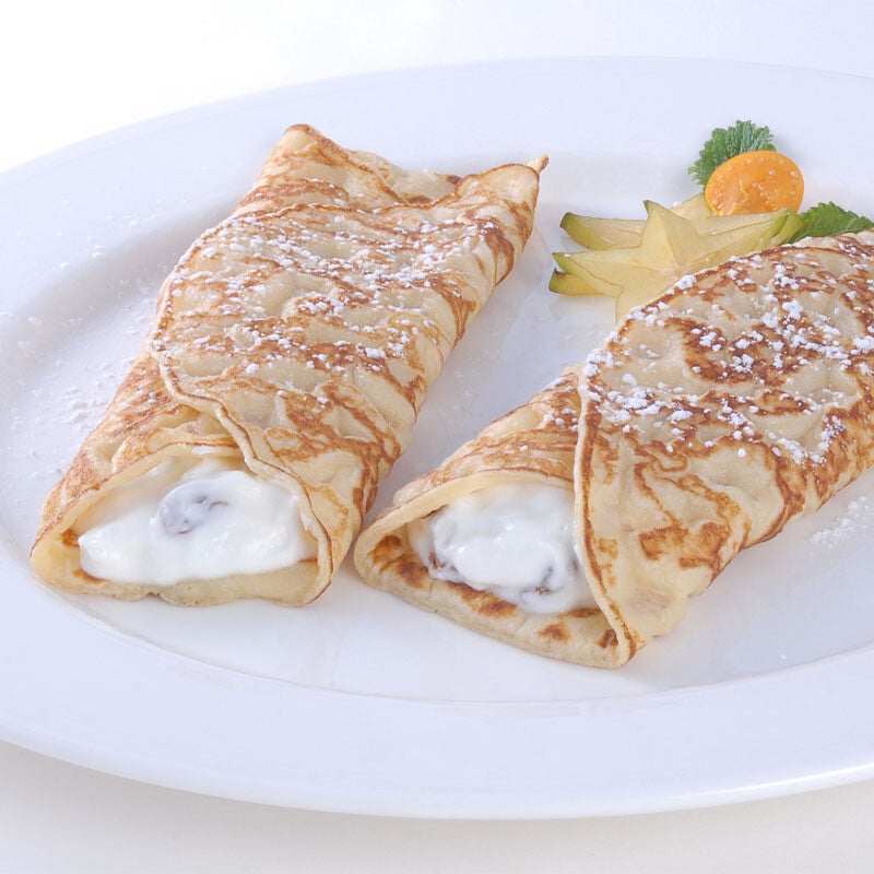 Bei Schalterstellung Combi auf 140°C vorheizen. Die gefrorenen Eierpfannkuchen auf die Lochbleche legen und einschieben, ca. 20 min. erhitzen. Anschließend noch 2 min.