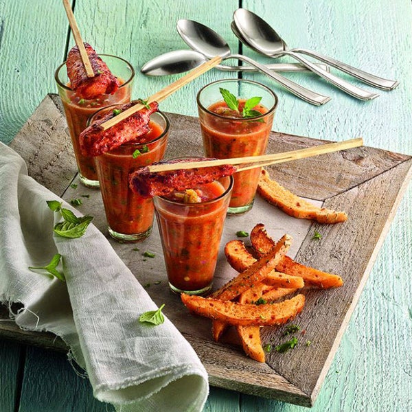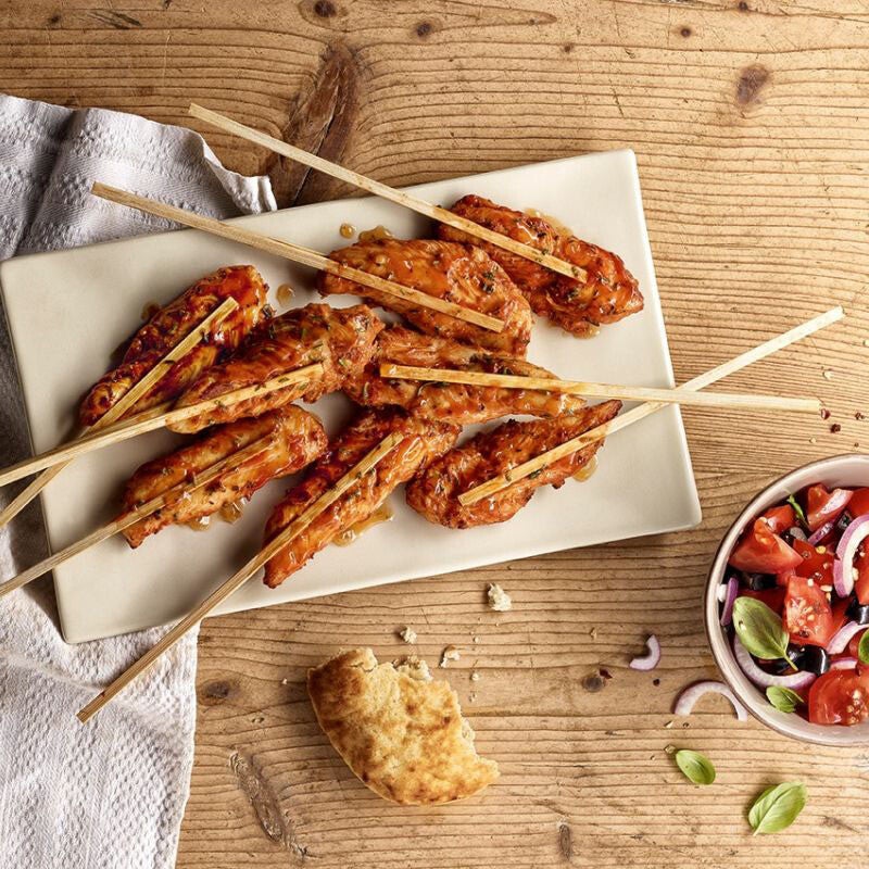 Stäbchentrick: Zwischen dem Double Stick aus Bambus lockt ein saftiges Hähncheninnenfilet in mediterraner Marinade. So geniesst man Finger Food elegant und kleckerfrei!